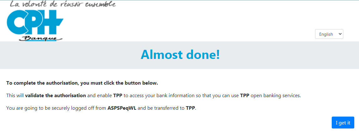 Before being redirected to the TPP App, the PSU will access a redirection screen with some context related to the given authorisation. This screen is slightly different for AIS and PIS.